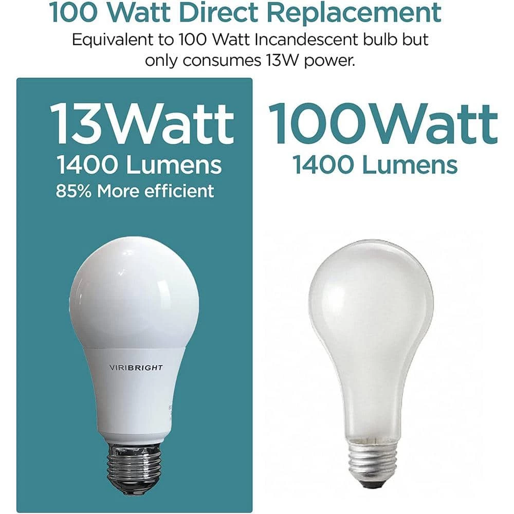 Viribrights line of 100-Watt equivalent LED A19 E26 base LED light bulbs provides the perfect blend of value and quality. This bulb uses only 13 actual watt of power saving up to 80% of energy when compared to traditional lights. Our bulb lasts up to 15 times longer than an average incandescent light bulb. With a bright daylight glow of 6500K, these LED bulbs will illuminate your dining room or other living space like never before. Save big when you select Viribright for your next lighting projects. Designed to be shatter-resistant, recyclable and mercury free these are durable and safe for the environment. Whether you do-it-yourself, find someone to do-it-for-me, or you’re a commercial customer (contractor builder, trader, renovator or interior designer) our lights are built for most applications.