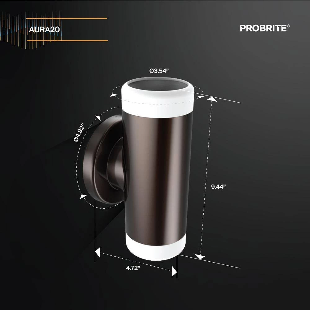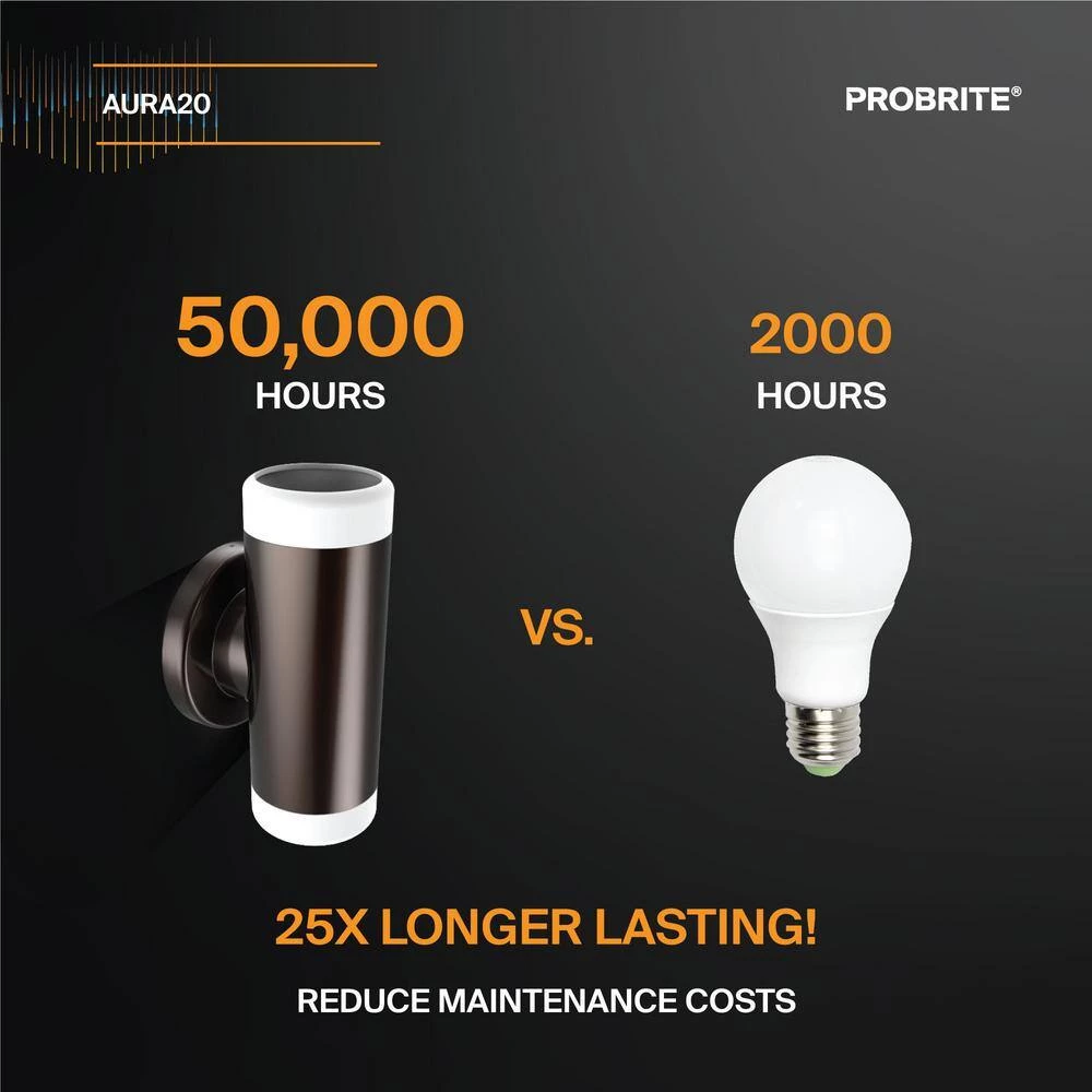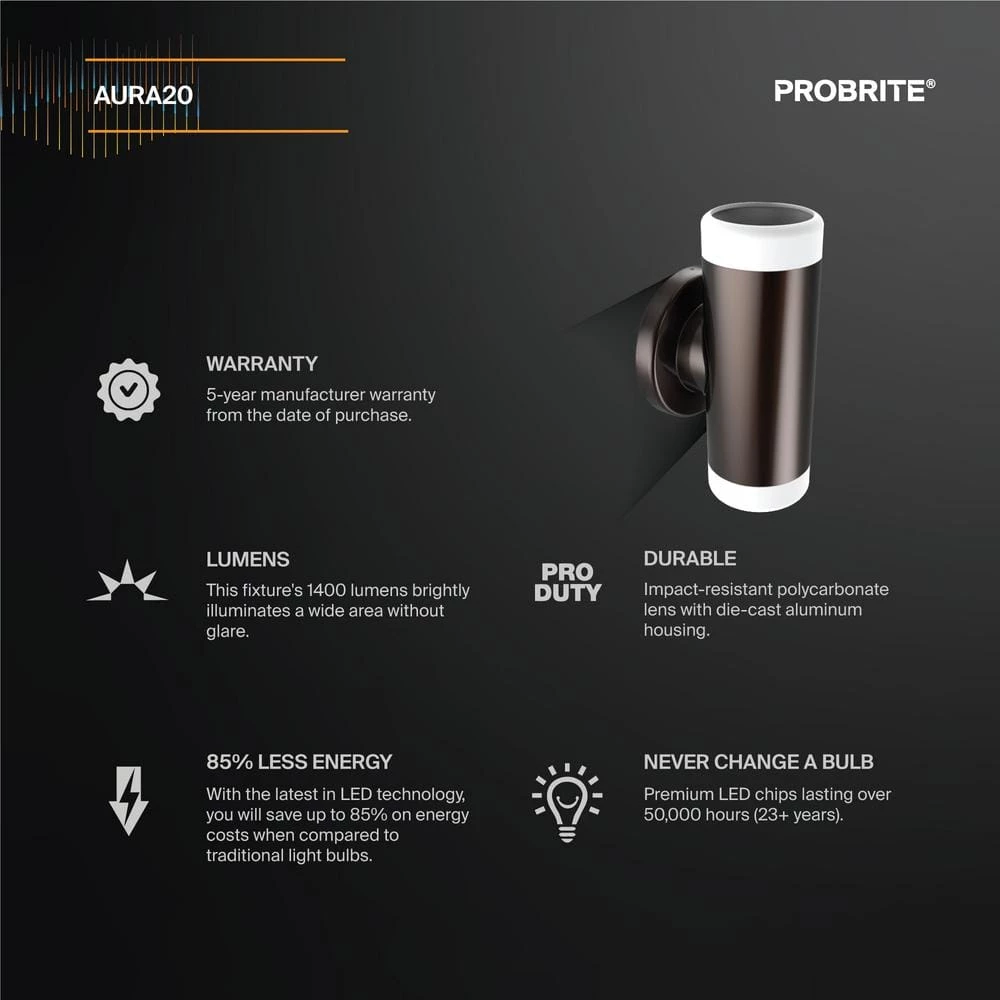 Beaming 1400 lumens of warm white light, this LED wall pack is an ideal security solution for non-industrial settings such as apartment complexes and high-end restaurants. The bronze powder-coated fixture has a sophisticated polish, welcoming guests and customers in entryways, on columns and at wall perimeters with a soft, glare-free glow from halo end caps. Expect the aluminum casing to resist corrosion for more than 50,000 hours of maintenance-free use. Installation is easy with the universal junction box mounting plate and the 20-Watt LED bulb will save $50 in annual energy costs, well beyond PROBRITEs 5-year warranty.