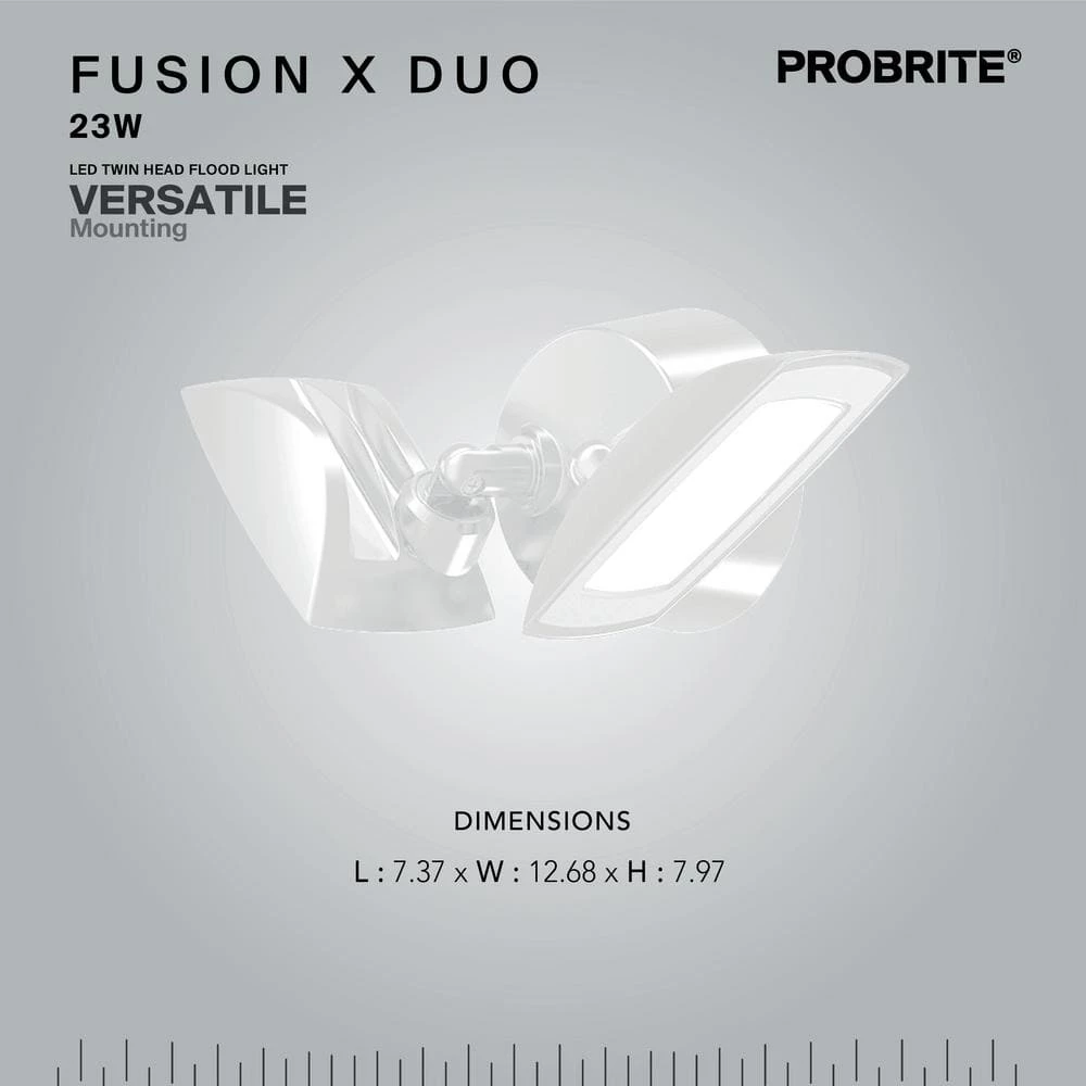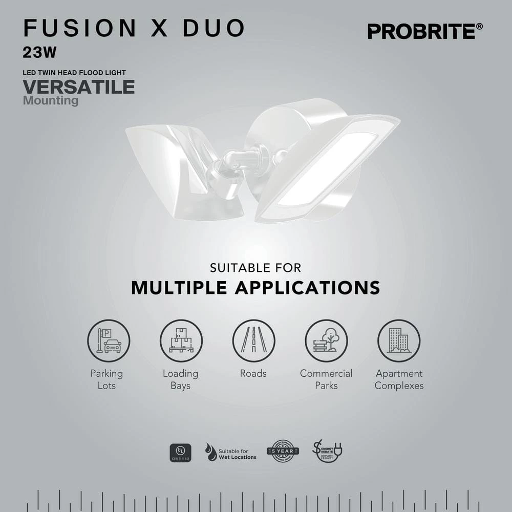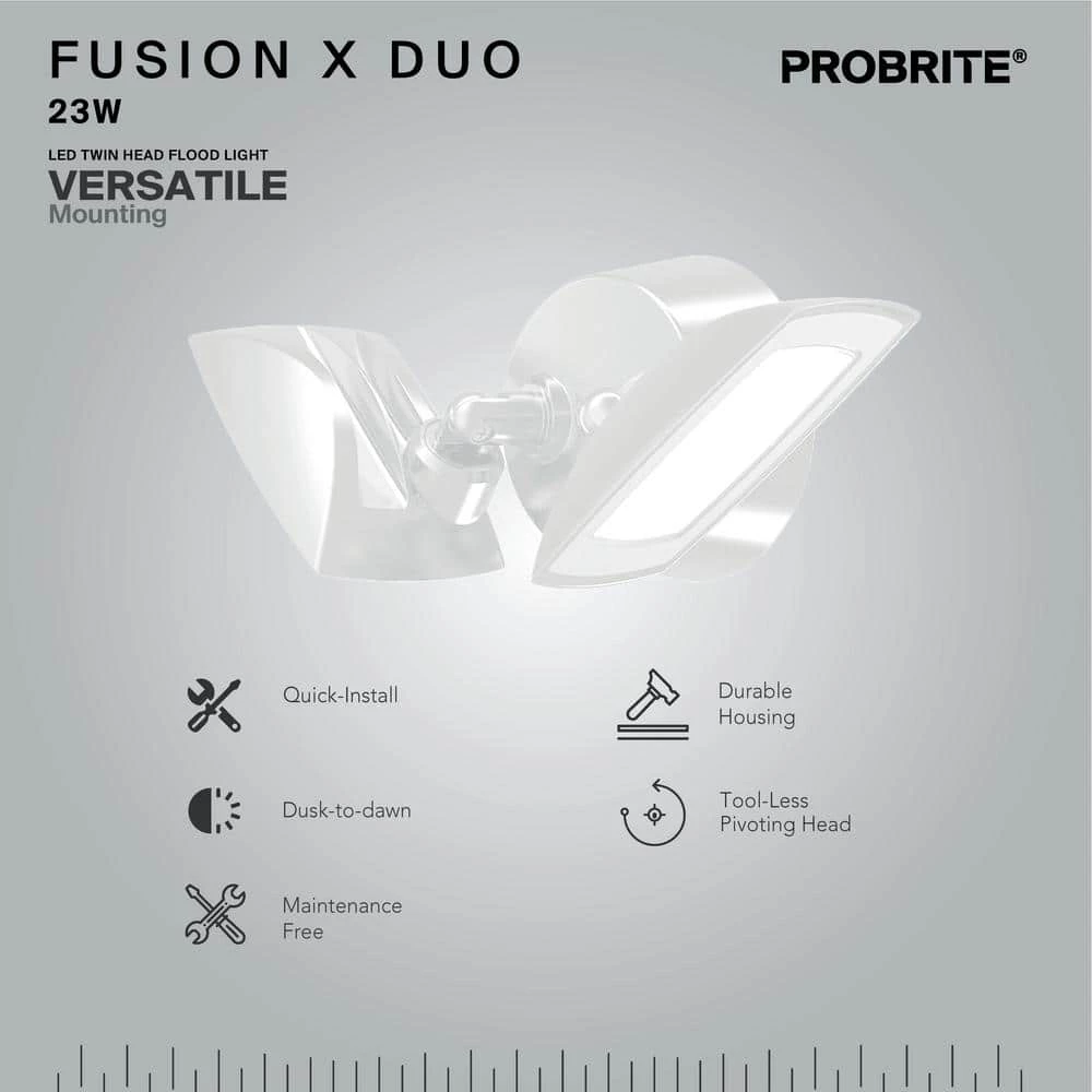 Powerful, agile and efficient. The twin heads on this flood light can each secure a 180-degree arc, saturating your property with 3000 lumens of 4000K bright white light using only 30-Watts. Installation is hands-free using the universal junction box mounting plate included with the fixture. You won’t even need tools to customize the angle of heads to your space. The die-cast aluminum housing is impact- and weather-resistant, with dusk to dawn photocell sensors that automatically turn the light on at nightfall and off at first light. Expect 50,000 hours of maintenance-free use, while the LED bulbs save about $40 a year on utility bills, well beyond PROBRITE’s 5-year warranty.