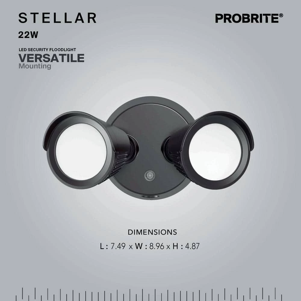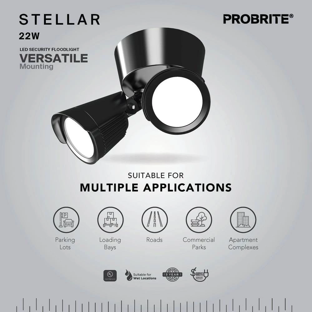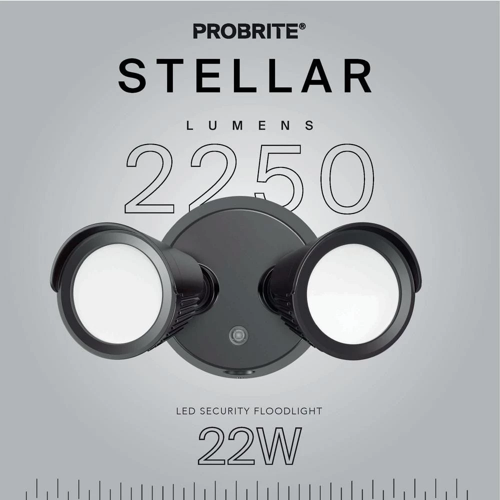 Powerful, agile and efficient. The twin heads on this flood light can each secure a 180-degree arc, saturating your property with 2200 lumens of 2700K to 5000K white light while using only 22-Watts. Installation is hands-free, using the universal junction box mounting plate. You won’t even need tools to customize the angle of each head to your space. The polycarbonate housing is impact- and weather-resistant, with dusk to dawn photocell sensors that automatically turn the lights on at nightfall and off at first light. Expect 50,000 hours of maintenance-free use, while the LED bulbs save about $40 in annual energy costs, well beyond PROBRITE’s 5-year warranty.