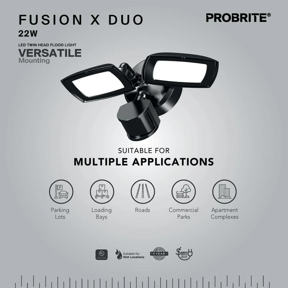 These 2 motion-activated security lights shine 3000 lumens of bright white light each on a building perimeter, landscape or sign using 30-Watts. Installation is hands-free. Mounted 8 ft. to 15 ft. high on a wall, eave or pole or on the ground, the fixtures cast wide beams for maximum coverage. The rugged die-cast aluminum housings are coated with a commercial-grade bronze powder to resist corrosion for 50,000 hours of maintenance-free use. The efficient LEDs use 85% less energy than 200-Watt incandescent bulbs, saving you a combined $110 a year on utility bills, well beyond PROBRITE’s 5-year warranty.