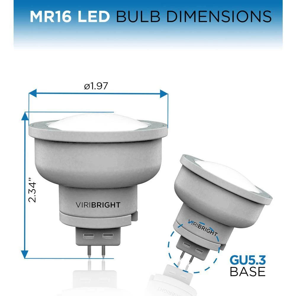 The MR16 LED non-dimmable bulb makes for the perfect 35-Watt halogen replicant with its 4.2-Watt energy consumption. This takes energy saving to a whole new level as you’ll increase your lighting quality while decreasing your out-of-pocket expense. Coming in at just under $1 per year on energy cost, your monetary commitment will be minimal. Along with that, the warm white 2700K lighting you’ll gain for your home will create a soothing atmosphere. With its wide beam angle and 310 Lumens of lush, warm light, this LED bulb outperforms your average 35-Watt halogen bulb. Along with that, its easy GU5.3 base makes this ideal for DIY installation. Premium lighting shouldn’t come at a premium price; upgrade your lighting standards and save more with Viribright. Go wide with the 80° beam angle on this MR16 bulb. Its broadly-dispersed lighting encompasses any area in your home to raise your overall lighting standards. Floodlights and recessed ceiling lights are perfect homes for this 2700K warm white bulb.