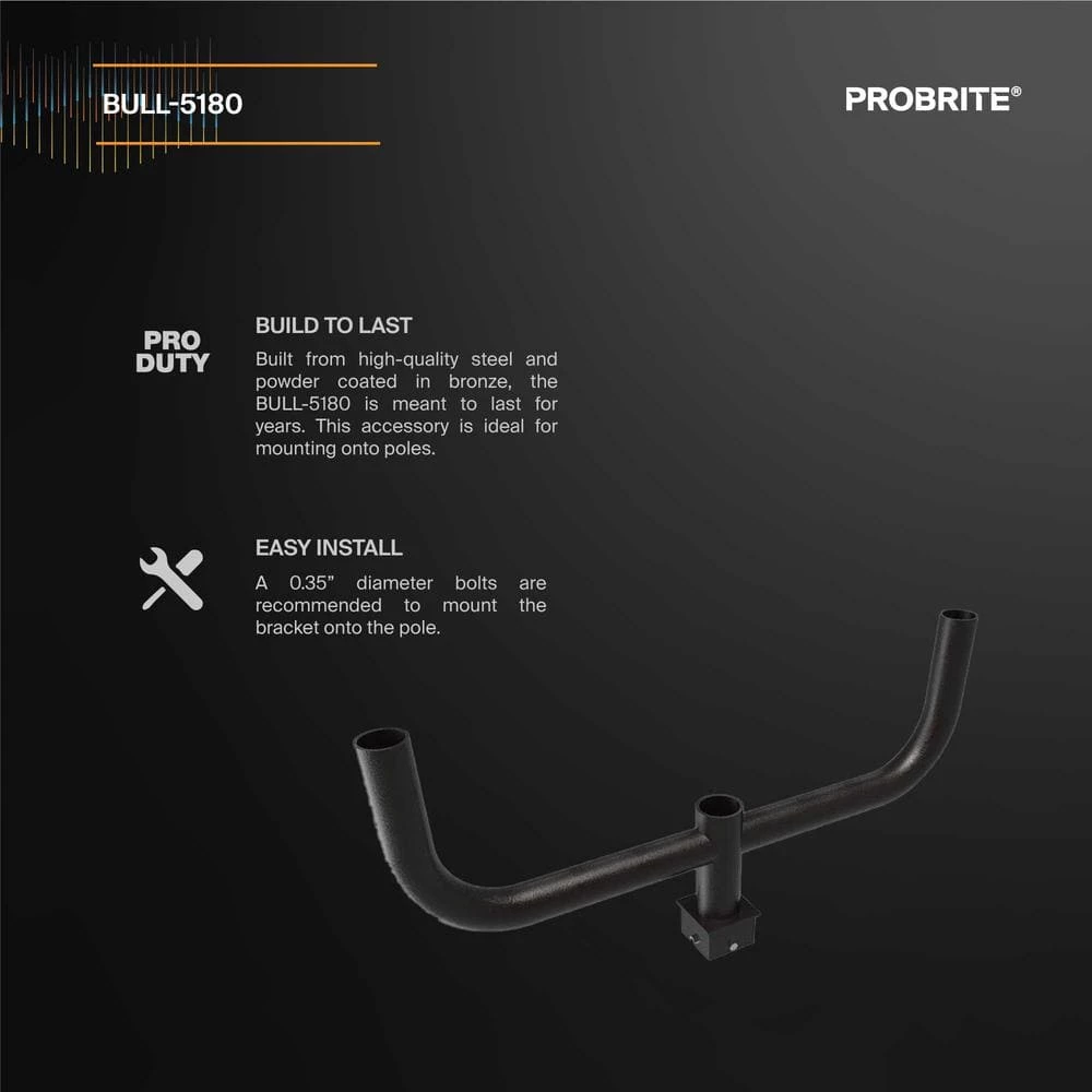 Engineered for those outdoor flood and area lighting projects that need more than one solution. The 180° double bullhorn style bracket brings your lit environment to the next level. This stainless steel bracket with reinforced double weld joints and two 2.375 inch O.D. vertical tenons set 42 in. inches apart from each other is ideal for your next security, parking, or even roadway lighting LED project. It can be easily mounted directly onto a 5 in. straight square pole, and the bronze powder-coated bracket is resistant to chipping and fading in any environment and backed by a 5-year manufacturer’s warranty. Should you have any questions regarding installation, replacement parts, or upgrade options.