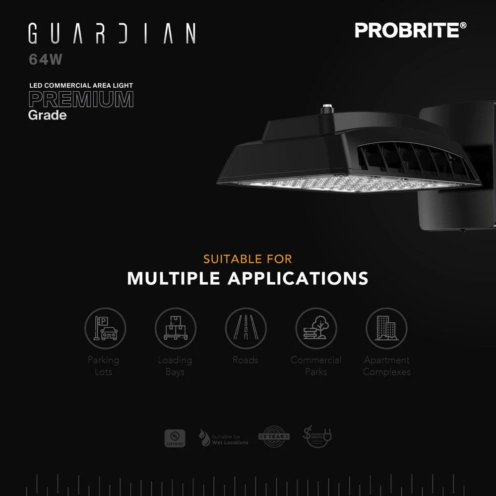 Introducing PROBRITE’s latest innovation, the Guardian, an all in 1 lighting solution for your outdoor security lighting scheme. It is high-powered yet incredibly efficient yielding 8500 Lumens, emitting 4000K bright white light and using only 64-Watt. What makes this LED flood light a valuable option for consumers is that it was designed with integrated LEDs. Consumers can expect the fixture to last over 50,000-hours or 23-years. In total, it will save almost $200 in utility costs on a-yearly basis. 1 of the leading features of this LED area light is photocell technology, making this a dusk to dawn outdoor light. Consumers can use the manual ON/OFF switch, should they be interested in controlling when the LED area light is on. Partner this with the 5-year manufacturer warranty and you have 1 top-notch product. Should you have any questions regarding installation, replacement parts or upgrade options, please contact the PROBRITE lighting specialist directly at support.