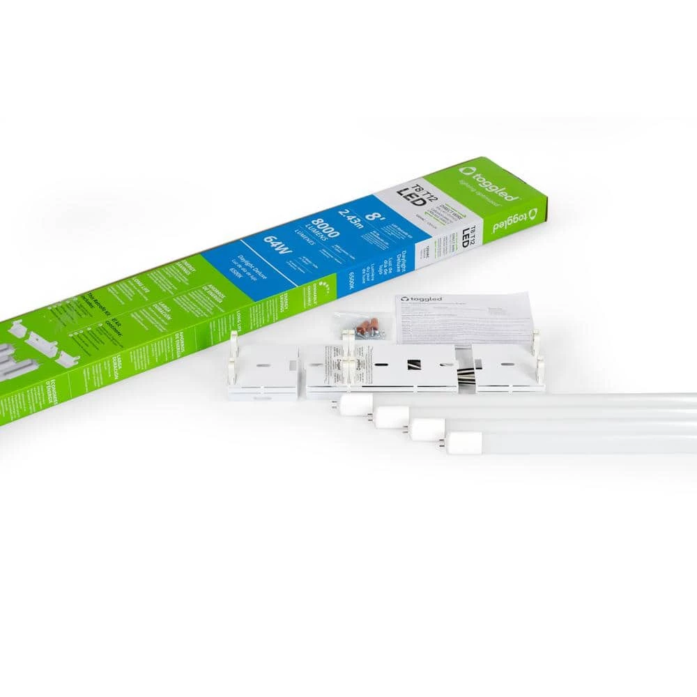 The toggled 8 ft. conversion kit uses an adjustable set of brackets and four 4 ft. (48 in.), 16-Watt (2000 Lumens) direct-wire LED tubes. It offers an economical alternative to inefficient fluorescent or HID lighting while significantly lowering energy and maintenance costs. Replaces T8 or T12 fluorescents.