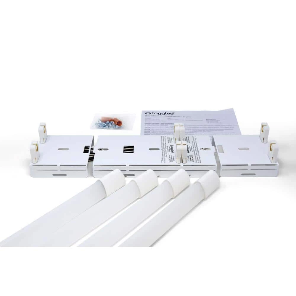 This toggled 8 ft. to 4 ft. conversion kits are designed to convert an existing 8 ft. fixture to use 4 ft. tubes. The kits can be used with either a 1 tube or 2 tube 8 ft. fixture. Once installed each 8 ft. tube can then be replaced with 2 4 ft. tubes. The kits adjust to the width of the fixture and come with self-tapping screws and new Amp holders, making it easy to install them onto your existing fixture.