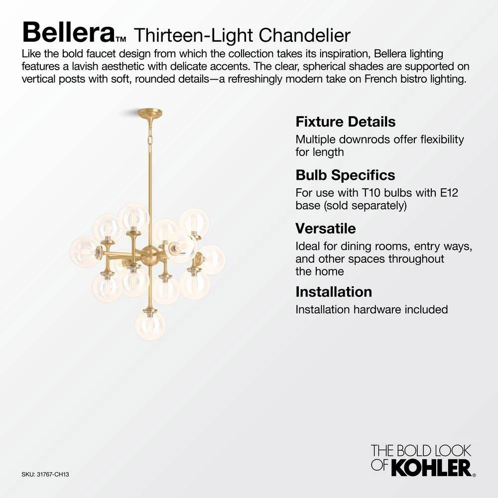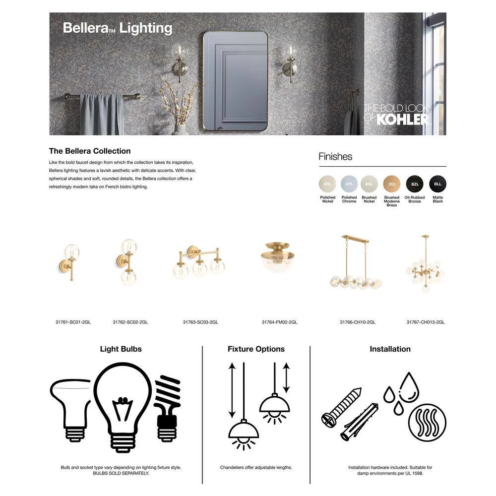 Distinguished by elegant, jewelry-inspired silhouettes, the Bellera lighting collection adds style and grace to the home with sconces, pendants, chandeliers and flush-mounts. Featuring clear glass globes, flared metal rods and bases and intricate metal detailing, Bellera fixtures deliver versatility with a transitional style that easily flows with your entire home’s aesthetic. Brilliant and functional, these pieces were created to complement the KOHLER Bellera faucet collection.