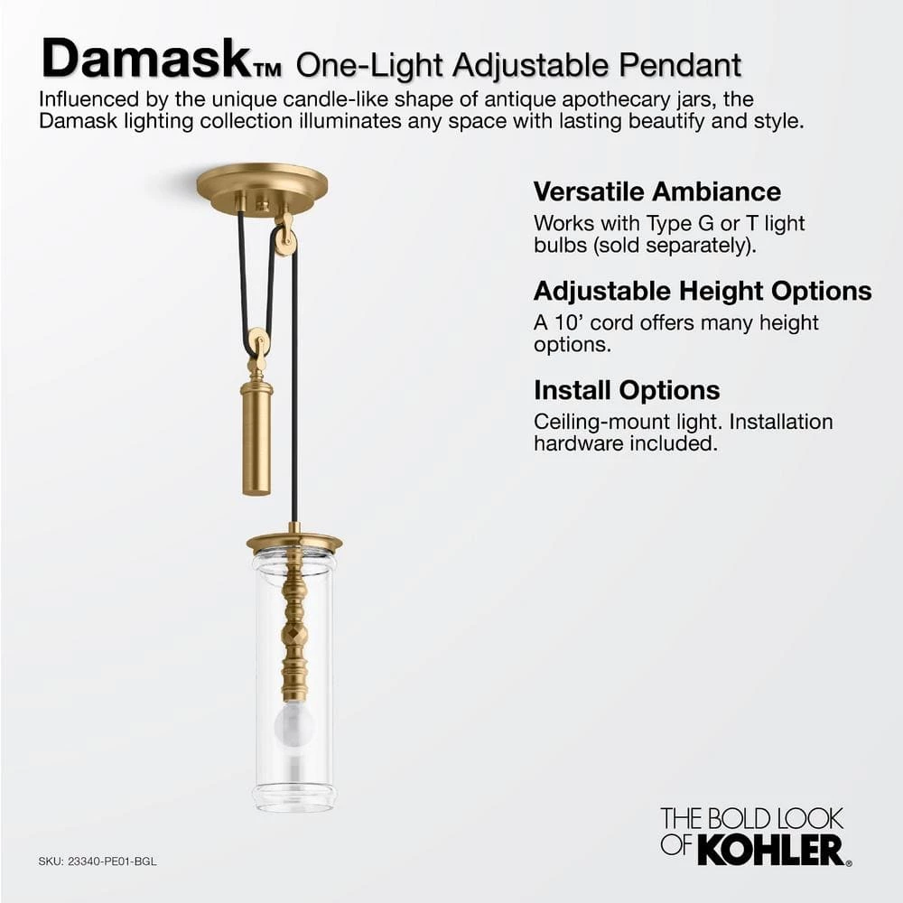 Influenced by the unique candle-like shape of antique apothecary jars. The Damask lighting collection illuminates any space with lasting beautify and style. It features a clear glass shade.