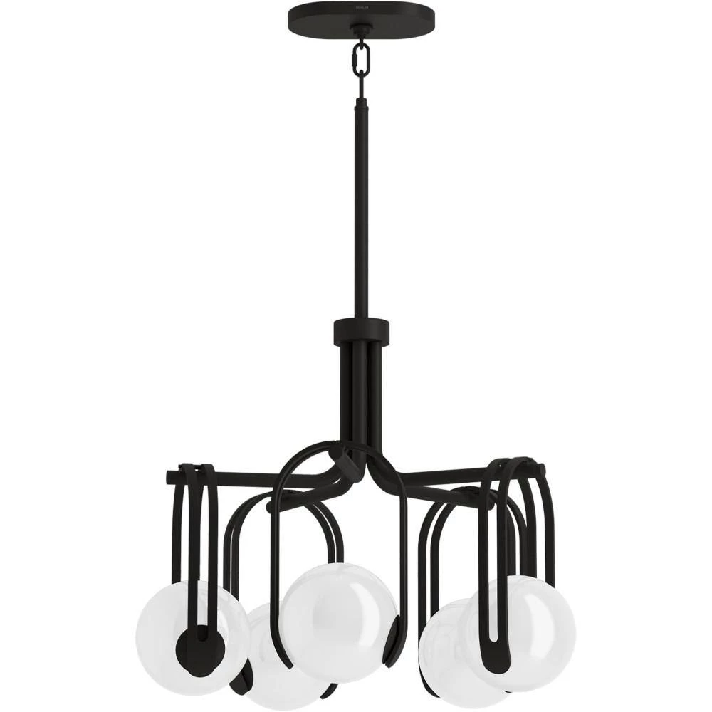 - Globular glass shades are gracefully suspended from curved metal bases in artist-inspired arrangements