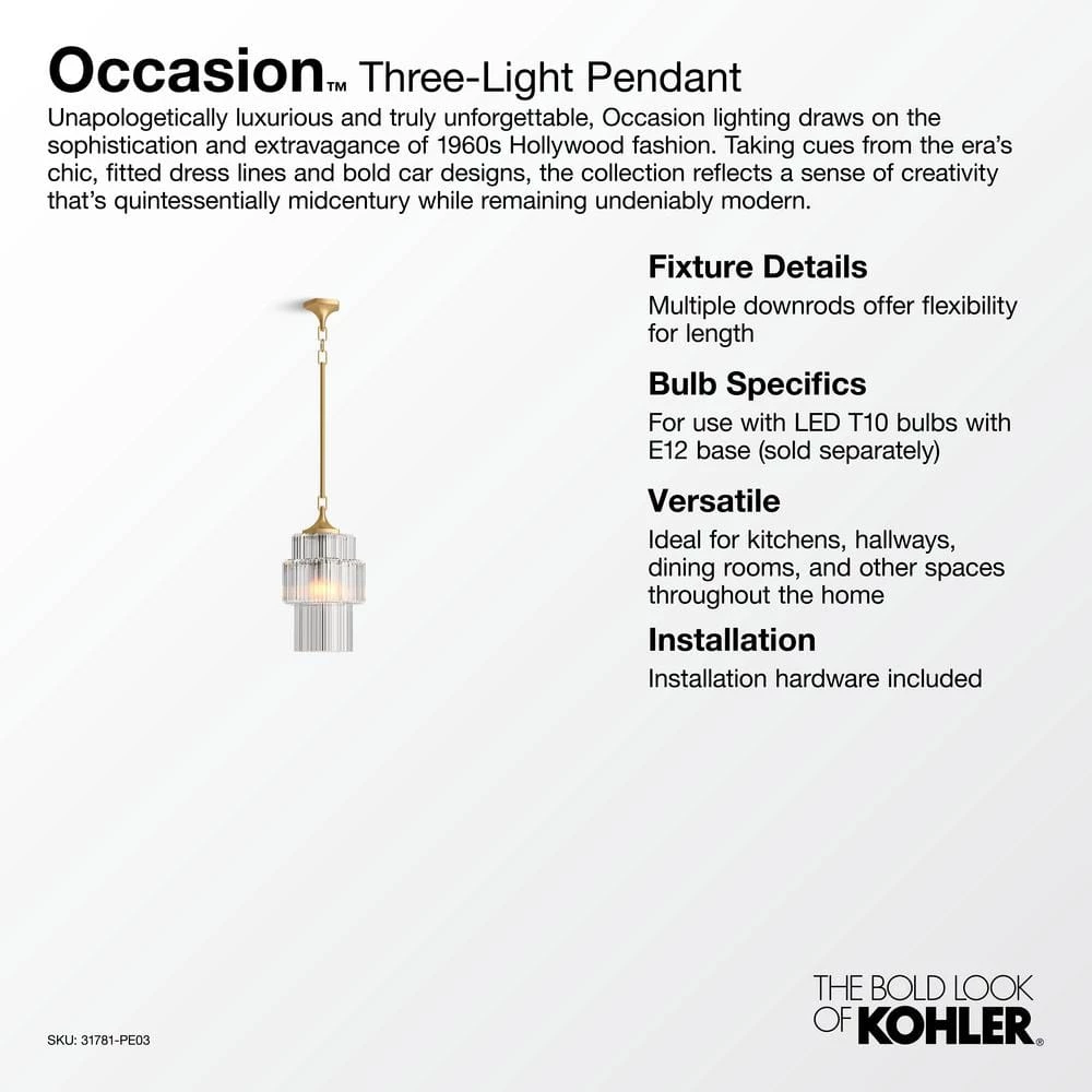 The Occasion lighting collection offers a modern rendition of 1960s Hollywood glamour across sconce, flush-mount and pendant designs. Faceted metal bases and fluted cylindrical glass shades combine in centerpieces as elegant as they are functional. Like its Golden Age inspiration, the lighting collection evokes a vintage starlet charisma. Alluring and stylish, these statement pieces were created to complement the KOHLER Occasion faucet collection.