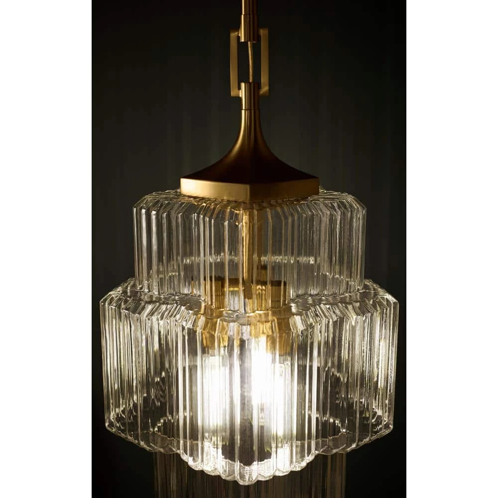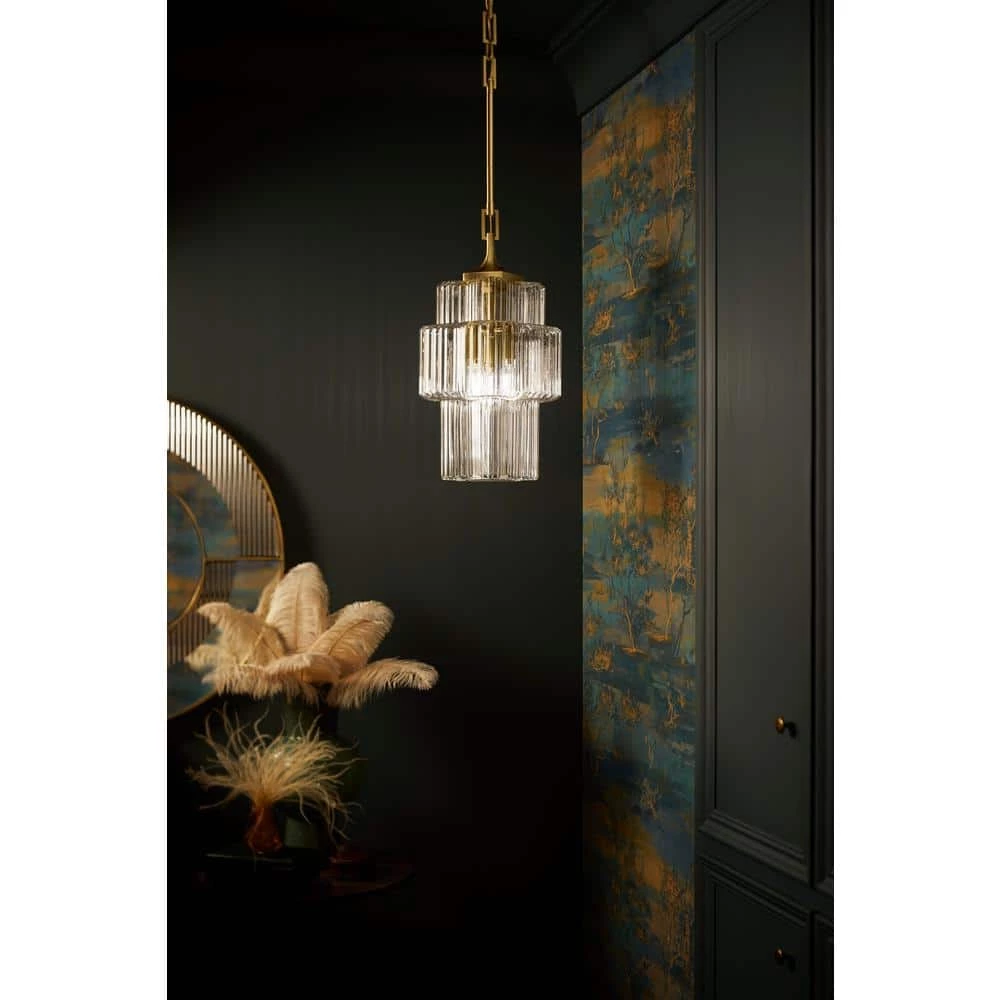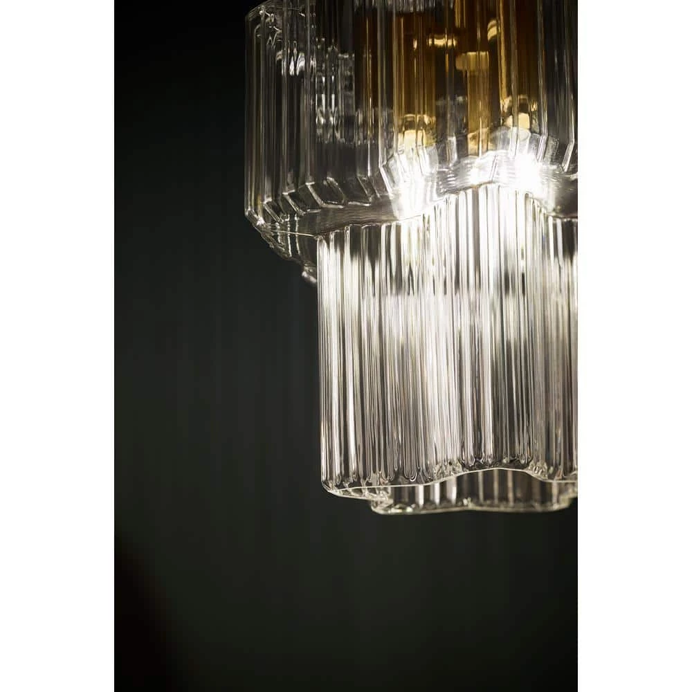 - Ridged cylindrical glass shades combine with faceted metals in vintage-inspired fixtures elegant enough for any room
