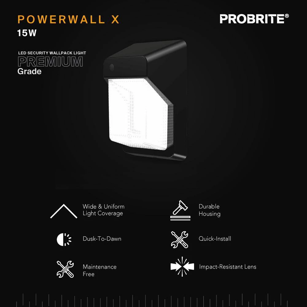 This pair of energy-efficient wall packs is powerful enough to secure a wall perimeter, garage, large backyard, loading bay, warehouse, apartment complex, hotel or office and retail complex with 1500 lumens of 4000K bright white light each, while using only 15-Watts. Install them on any wall, posts or columns using the universal junction box mounting knockout and 4-sided conduit entries, then let the dusk to dawn photocell technology automatically turn the lights on at sunset and off at sunrise. The aluminum housings resist corrosion for more than 50,000 hours of maintenance-free use. Each LED uses 85% less energy than a standard bulb, saving a combined $240 annually on utility bills long beyond PROBRITE’s 5-year warranty.