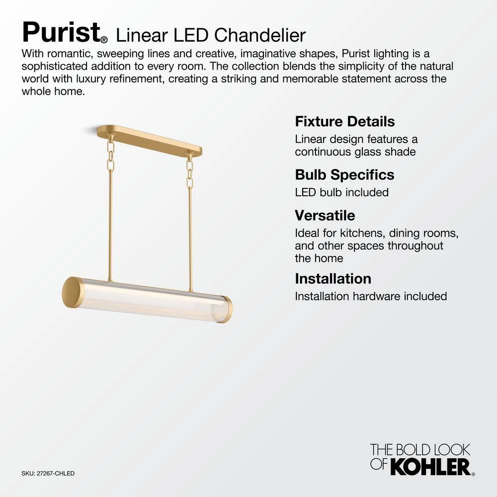 The sleek lines and modern design of Purist lighting complement contemporary home decor. Minimalist sconces, pendants, and linear chandeliers provide a soft, inviting warmth, reflecting elegant simplicity. Available in an array of finishes, these versatile fixtures were created to complement the KOHLER Purist faucet collection for a cohesive home design.