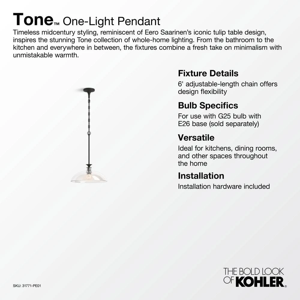 With domed, clear-glass shades, mixed-metal trumpet bases and intersecting rod supports, the Tone lighting collection delivers a fresh take on midcentury modern style. Blending minimalism, warmth and thoughtful functionality, Tone lighting fixtures are versatile enough for any space in your home. These contemporary pieces were created to complement the KOHLER Tone faucet collection for a cohesive home design.