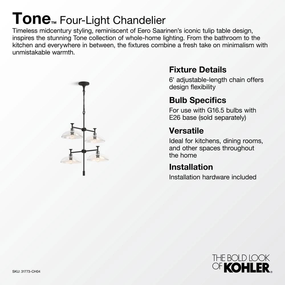 - Requires 4 bulbs with candelabra (E12) base, type G bulb recommended (sold separately)