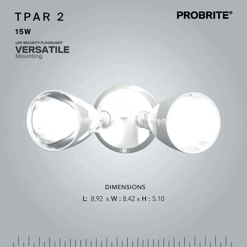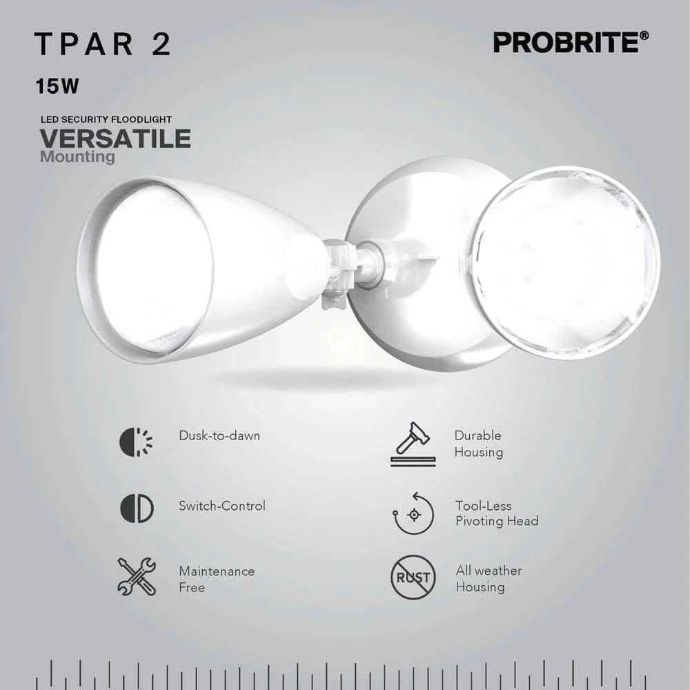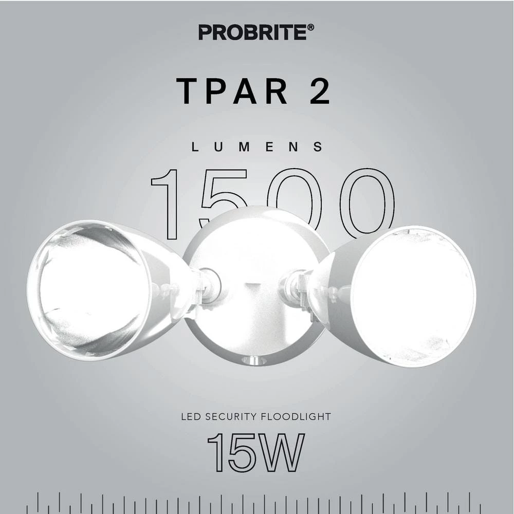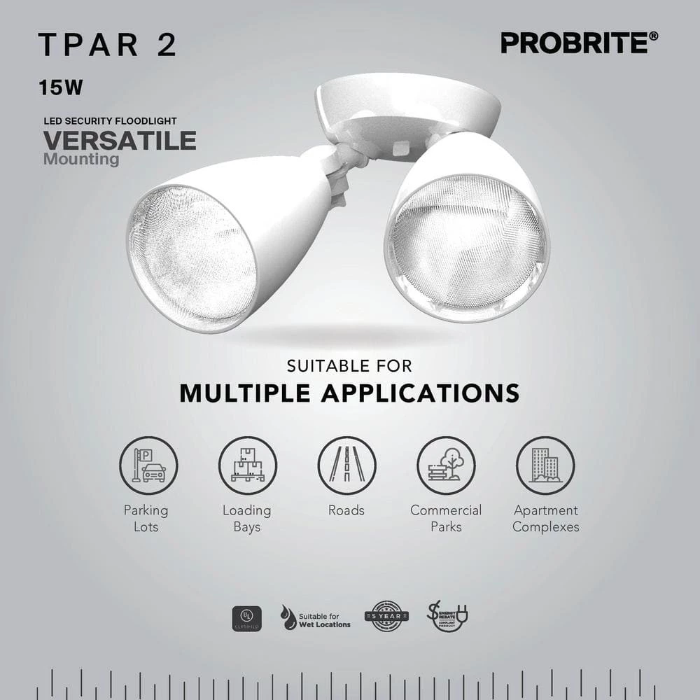 Adjustable twin heads on this flood light let you direct 1500 lumens of 4000K bright white light wherever you need it using only 15-Watts. Installing the fixture is hands-free and simple using the integral hooking wire. Use the detachable mounting plate to mount the light on a wall or eave to secure a driveway, entryway or facade. Then, let the dusk to dawn photocell sensors automatically turn the lights on at nightfall and off at first light.The impact- and weather-resistant ABS thermal polymer housing easily stands up to 50,000 hours of maintenance-free use, and the energy-efficient LED will reduce your annual utility bills well beyond PROBRITE’s 5-year warranty.